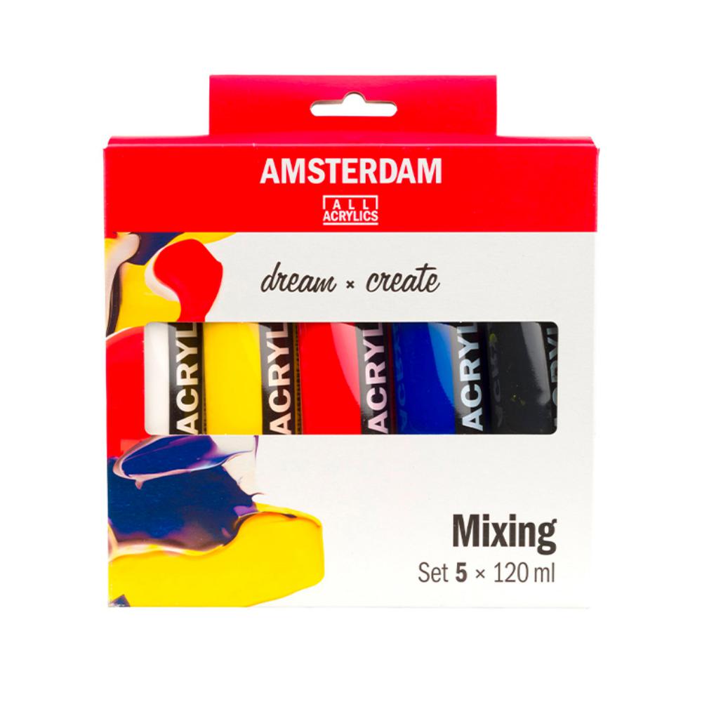 Este set te proporciona 5 grandes básicos en tubos grandes: Blanco titanio, negro óxido y tres colores cálidos de mezcla (amarillo azo claro, rojo naftol medio y azul ultramar). Son perfectos colores de mezcla para dar inicio a tu paleta de colores. Mezcla estos colores para crear una gama infinita de tonos diferentes. Contenido: 5 tubos de 120 ml (105 Blanco titanio – 268 Amarillo azo claro – 396 Rojo naftol medio – 504 Azul ultramar – 735 Negro óxido).