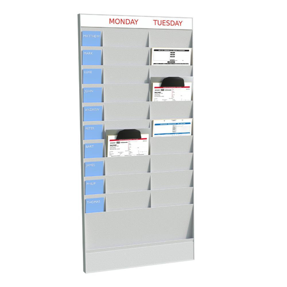 Perfecto para cualquier oficina. Puede usarse como un planning semanal o para un planning de siete proyectos o artículos. Tanto la estructura como las casillas están fabricados en poliestireno ultra resistente a choques, en color gris. Dividido en diferentes módulos (módulo base, módulo adicional y módulo complementario) se puede personalizar según las necesidades. 10 casillas con visores para nombres (persona, servicio, horas…). Dimensiones útiles de la casilla: 29,5 x 10 x 1 cm con una parte visible de 9 cm. 20 casillas A4 formato. Dimension útiles de la casilla : 29,5 x 23,4 x 1 cm con una parte visible 9 cm. 1 casilla de reserva. Dimensiones útiles de la casilla : 29,5 x 57 x 2 cm. Medidas módulo: 126,3 x 58 x 4,6 cm.
