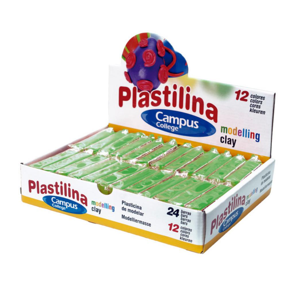 Caja de 24 barras de plastilina para modelar de 60 gramos por unidad. Apta para uso escolar. Muy moldeable, se alisa bien con los dedos. Gran plasticidad y consistencia. No se seca y se puede barnizar. Los colores se pueden mezclar entre sí. Color: verde claro.