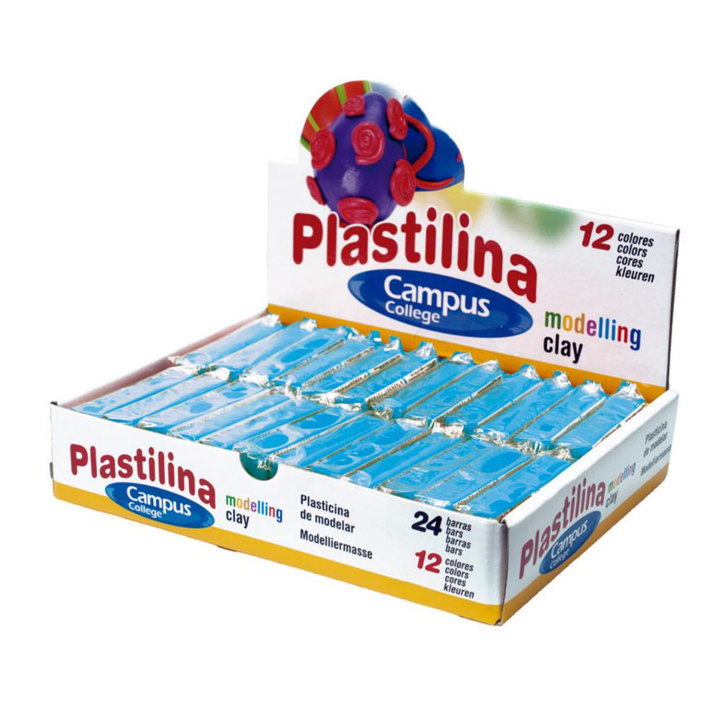 Caja de 24 barras de plastilina para modelar de 60 gramos por unidad. Apta para uso escolar. Muy moldeable, se alisa bien con los dedos. Gran plasticidad y consistencia. No se seca y se puede barnizar. Los colores se pueden mezclar entre sí. Color: azul claro.