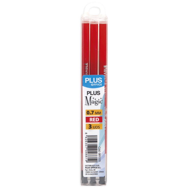 Recambio para bolígrafo borrable Plus Magic Clik. Trazo 0,7 mm. Caja de 3 unidades color rojo.