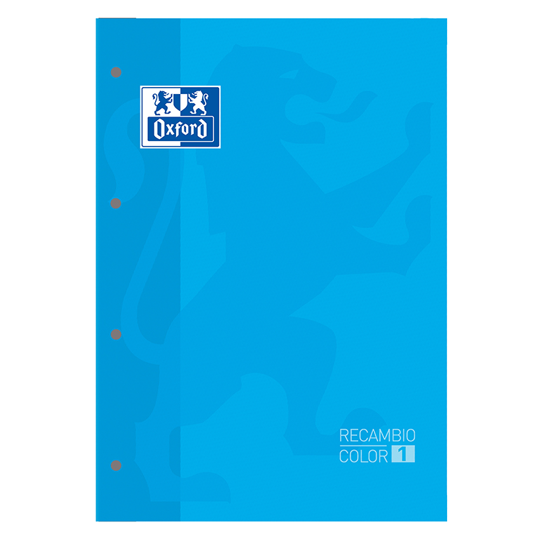 Recambio 80 hojas 90 gramos. Cuadrícula 5×5 mm. Recuadro a juego de la tapa. Encolado, con bandas de color. Formato A4. Color: turquesa.