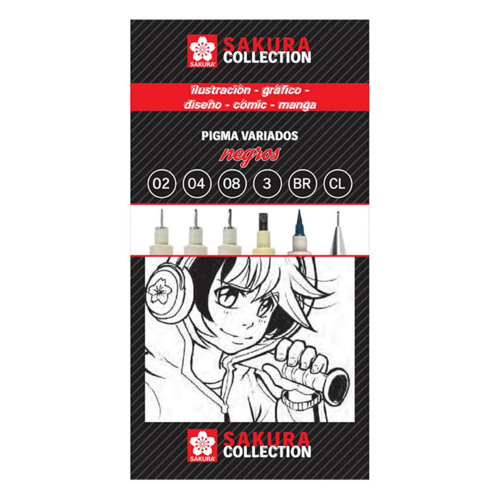 Rotuladores negros con distintas puntas más un portaminas de 0.5 mm. Incluye: rotulador Pigma Micron (0.2, 0.4 y 0.8 mm), rotulador Pigma Graphic (3mm), rotulador Pigma Brush (135 mm trazado) y portaminas de 0.5 mm. Bolsa de 6 unidades.