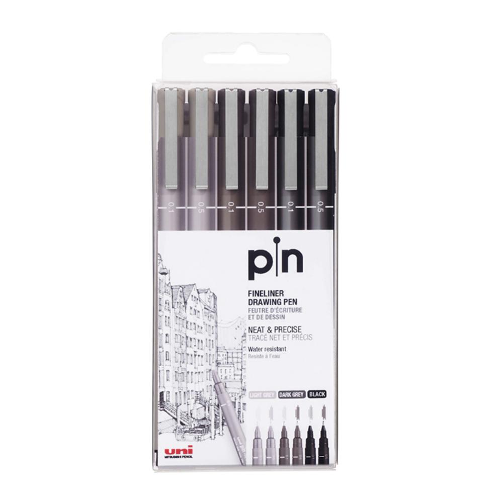 Tinta pigmentada de gran resistencia al agua que hace que una vez seca no se pueda borrar incluso si se vierte agua sobre la página, también tiene una gran resistencia a la luz y su color no disminuye aún a pesar de estar expuesto a la luz directa. Los rotuladores Uni Pin son ideales para dibujo profesional, artístico y para la escritura, ofreciendo un trazo nítido y suave a la vez. Punta poliacetal. Cuerpo de plástico (PP). Ancho de trazo: 0.1 (gris claro), 0.5(gris claro), 0.1 (gris oscuro), 0.5 (gris oscuro), 0.1 (negro) y 0.5 (negro) mm.
