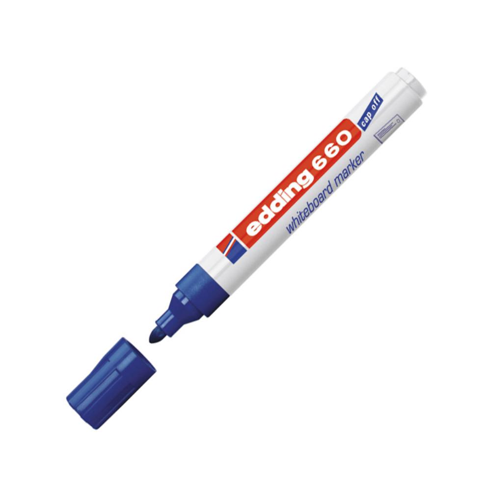 Marcador para pizarra blanca con punta redonda y cuerpo de plástico. Tinta pigmentada casi sin olor. Sistema cap-off que permite permanecer destapado sin secarse varios días. Envase: 10 unidades. Trazo: 1,5 – 3 mm. Color: azul.