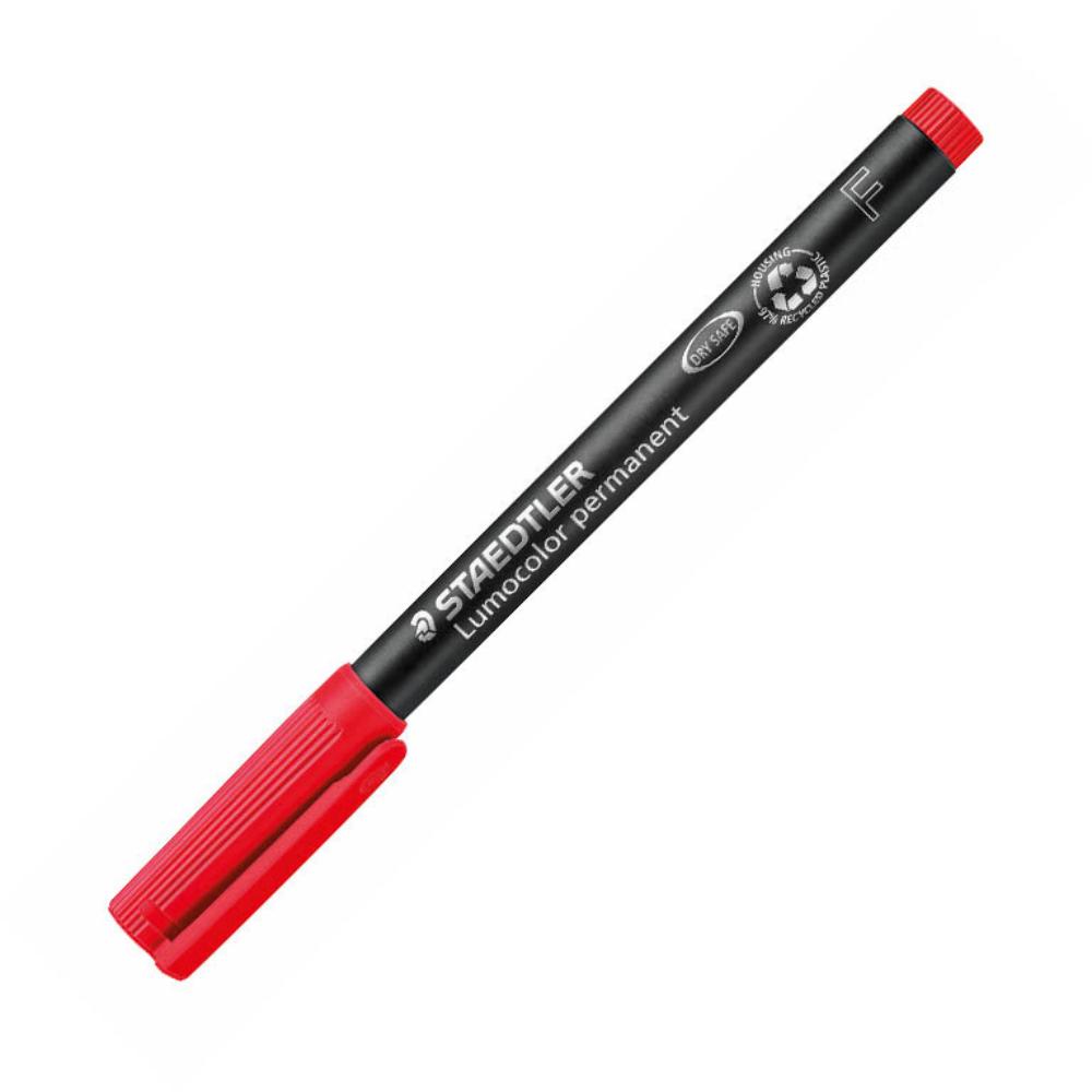 Rotuladores especiales para retroproyección. Tinta permanente. Punta fina de 0,6 mm. Color: rojo. Envase de 10 unidades. Carcasa fabricada con un 97% de plástico reciclado según ISO 14201 (cuerpo, capuchón y embellecedor)