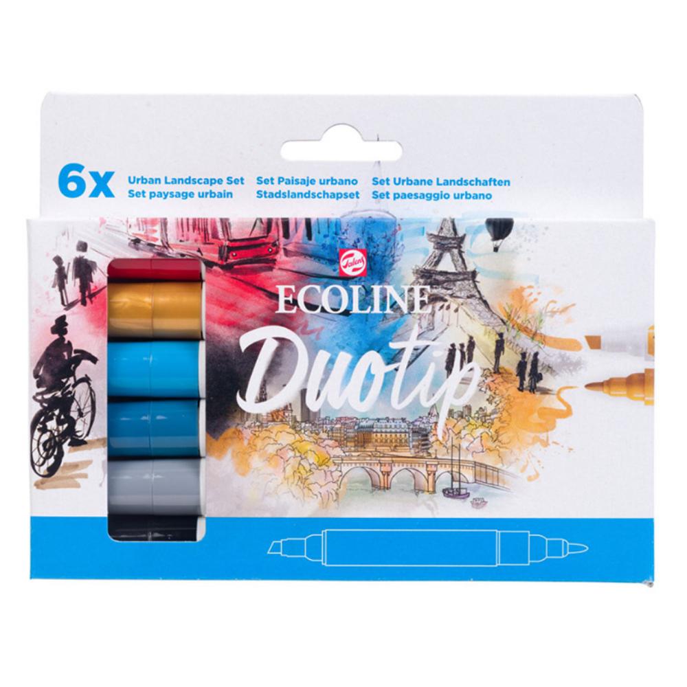 Este estuche de 6 rotuladores Duotip te ofrece una gran selección de colores para realizar bocetos urbanos rápidos. Los rotuladores Ecoline Duotip contienen pintura de acuarela concentrada y transparente. Estos colores brillantes de acuarela, en combinación con las dos puntas diferentes, una redonda (fina) y otra biselada (más ancha), te dan libertad para trazar líneas finas o anchas y colorear superficies más grandes. Mezcla los colores con agua y un pincel para obtener bonitos efectos de acuarela y transiciones perfectas de color.Incluye: 6rotuladores (334 Escarlata, 407 Ocre oscuro, 578 Azul cian celeste, 508 Azul de Prusia, 717 Gris frío, 700 Negro).