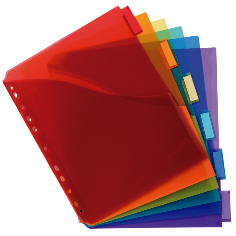 CompararSeparadores fabricados en polipropileno de 100 micras. Con pestañas personalizables con fundas para meter etiquetas. Alta resistencia. Medidas: 300 x 250 mm. Tamaño: A4+. Separadores: 6. Taladros: 11.