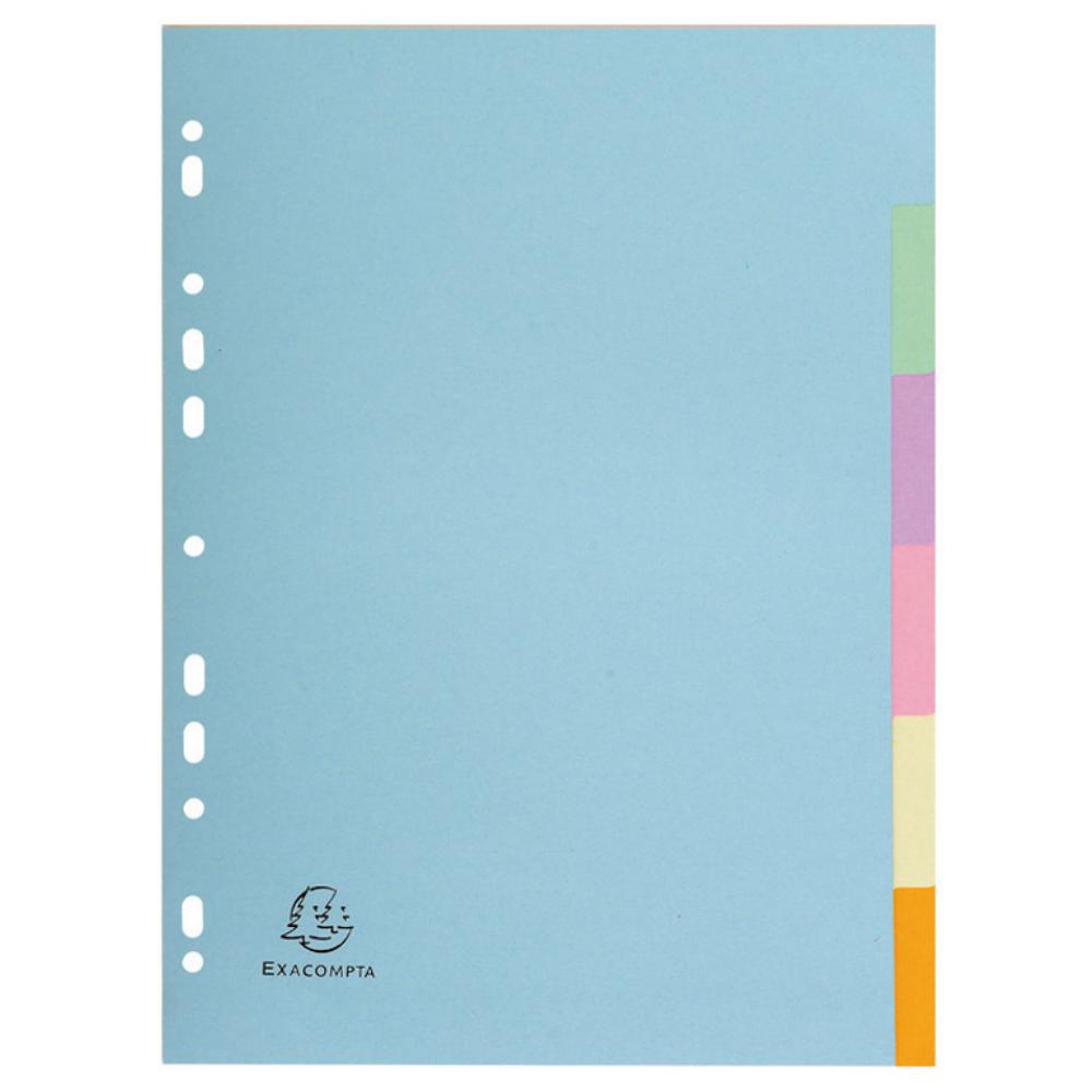 Separadores de cartulina flexible de 170 gr. Colores pastel. Pestañas reforzadas que permiten identificar los compartimentos. Medidas: 297 x 225 mm. Separadores: 6. Taladros: 11.