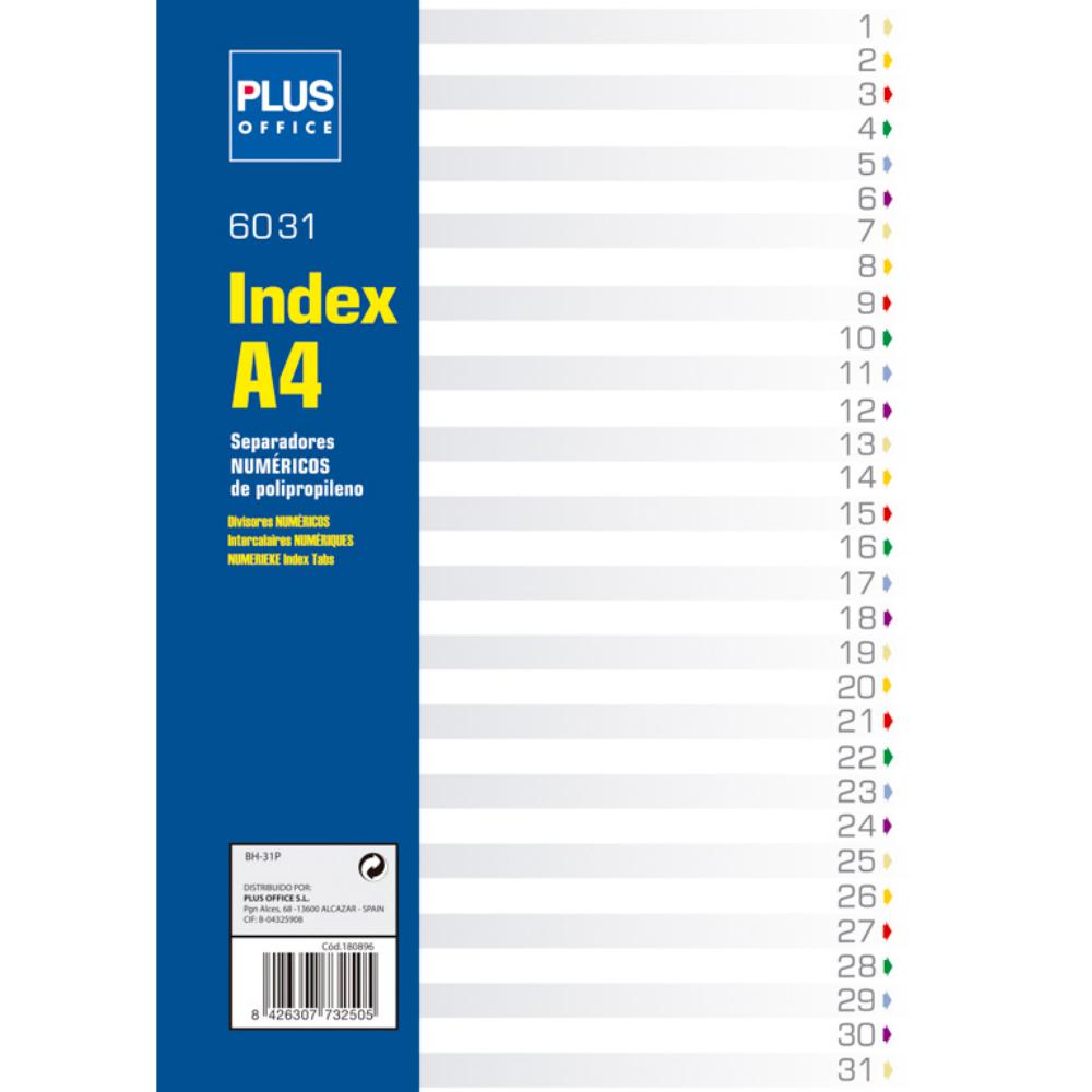 Indice numérico fabricado en polipropileno. De larga duración. Medidas: 297 x 210 mm. 150 micras.