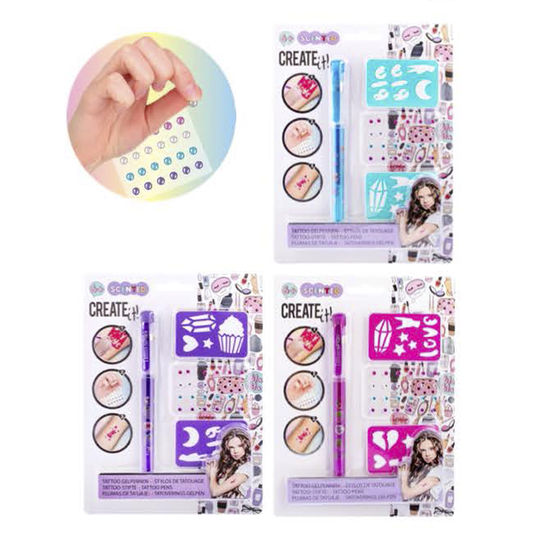 Crea tatuajes geniales, brillantes y perfumados con el bolígrafo de tatuajes Create it! Diamonds & Stencil. Lávate con agua para remover y crear nuevos. ¡Incluye bolígrafo perfumado, diamantes y plantilla para tatuajes!