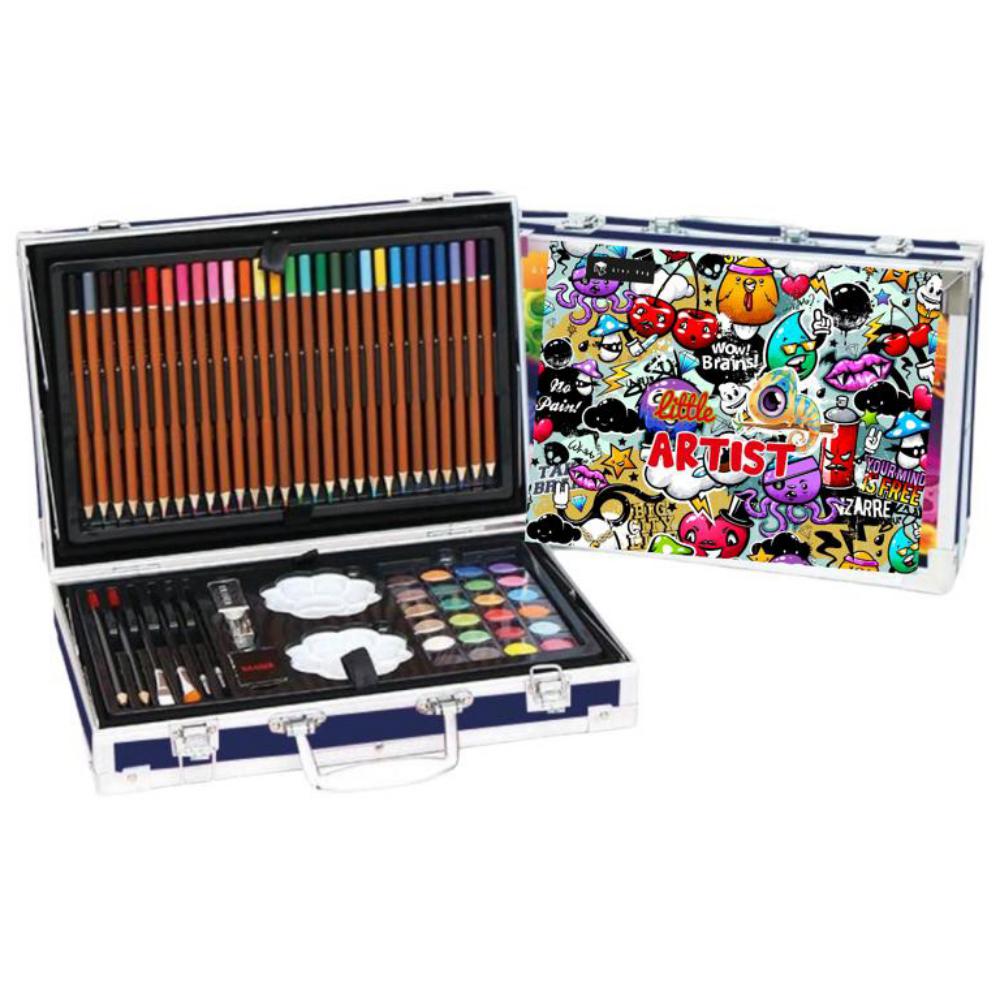 Maletín de aluminio resistente y fácil de transportar gracias a su asa. El contenido del maletín es de 28 lápices de colores, 24 acuarelas secas en pastilla, pinceles, 1 goma de borrar, 1 paletas de mezcla, 2 lápiz HB, 1 afilalápices. El mejor regalo para principiantes, estudiantes, artistas aficionados, profesionales… Maletín con 145 piezas.