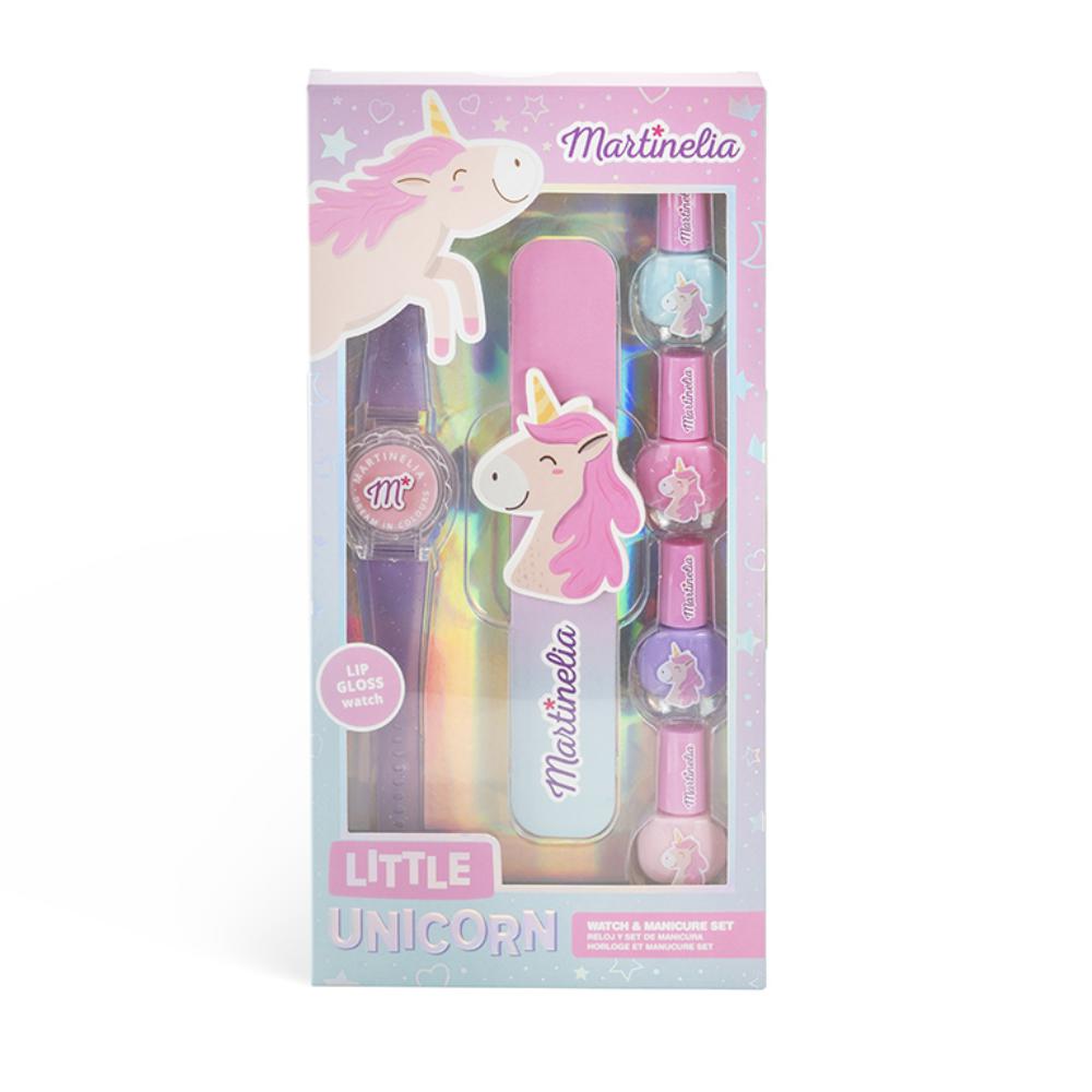 Set de reloj y manicura Little Unicorn de Martinelia. Incluye: 4 esmaltes de uñas en colores pastel, reloj con brillo de labios y una lima de uñas. Edad +3 años.