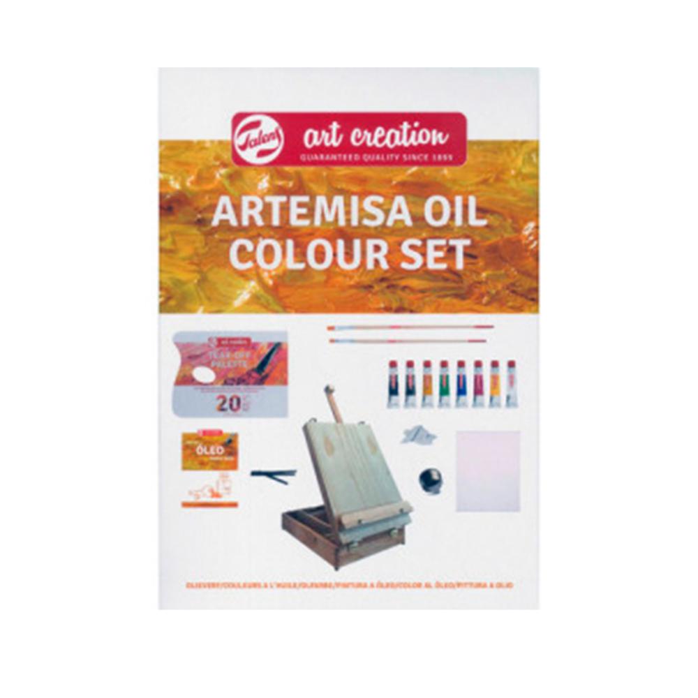 Set Talens perfecto para inciarse al óleo. Set de 17 unidades. Contenido: 8 colores óleo de 12 ml, 1 caballete de sobremesa, 1 tablilla, 1 libro paso a paso, 2 pinceles, paletas desechables, 1 pocillo, carboncillos y 1 trapo de tela.