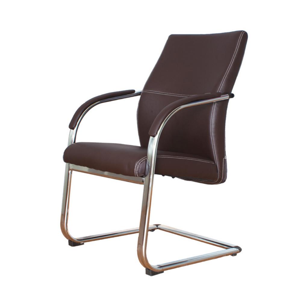 Silla fabricada en piel con respaldo a media altura. Asiento y respaldo acolchados. Reposabrazos revestidos en piel. Perfiles laterales, estribos de sujeción y estructura de patín en tubo de acero cromado. Color: marrón. Dimensiones (anchura x altura x profundidad): 100 x 59 x 63 cm.
