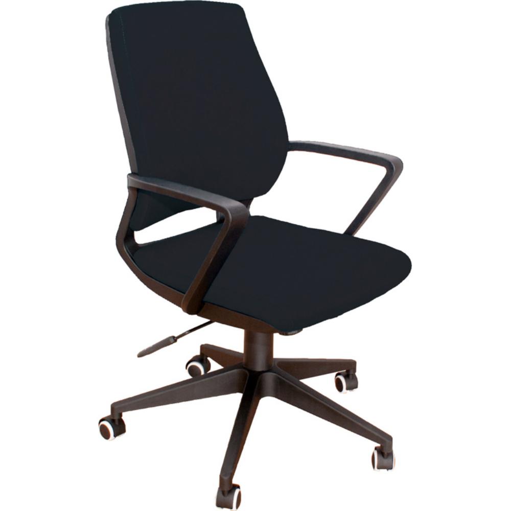 Silla de oficina giratoria. Respaldo y asiento acolchados. Asiento ajustable en altura (10 cm). Brazos en polipropileno de alta resistencia. Base de 5 radios con ruedas. Dimensiones (anchura x altura x profundidad): 62 x 96-106 x 59 cm. Color: negro.
