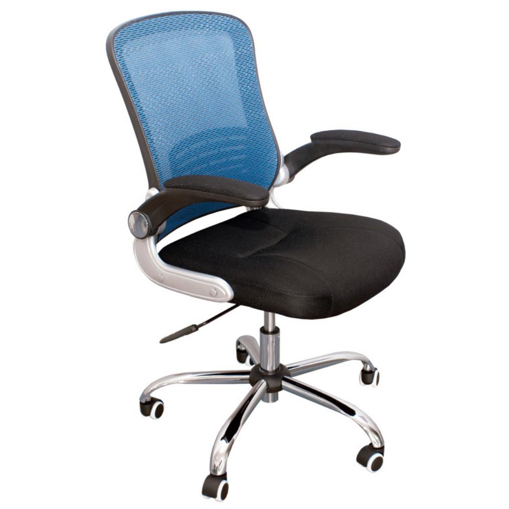 Silla con respaldo de malla azul con marco de polipropileno negro. Asiento acolchado y ajuste en altura (8 cm): entre 97 y 105 cm. Regulación en inclinación. Asiento acolchado. Brazos abatibles. Base cromada de cinco radios con ruedas. Dimensiones (anchura x altura x profundidad): 66 x 97-105 x 62 cm.