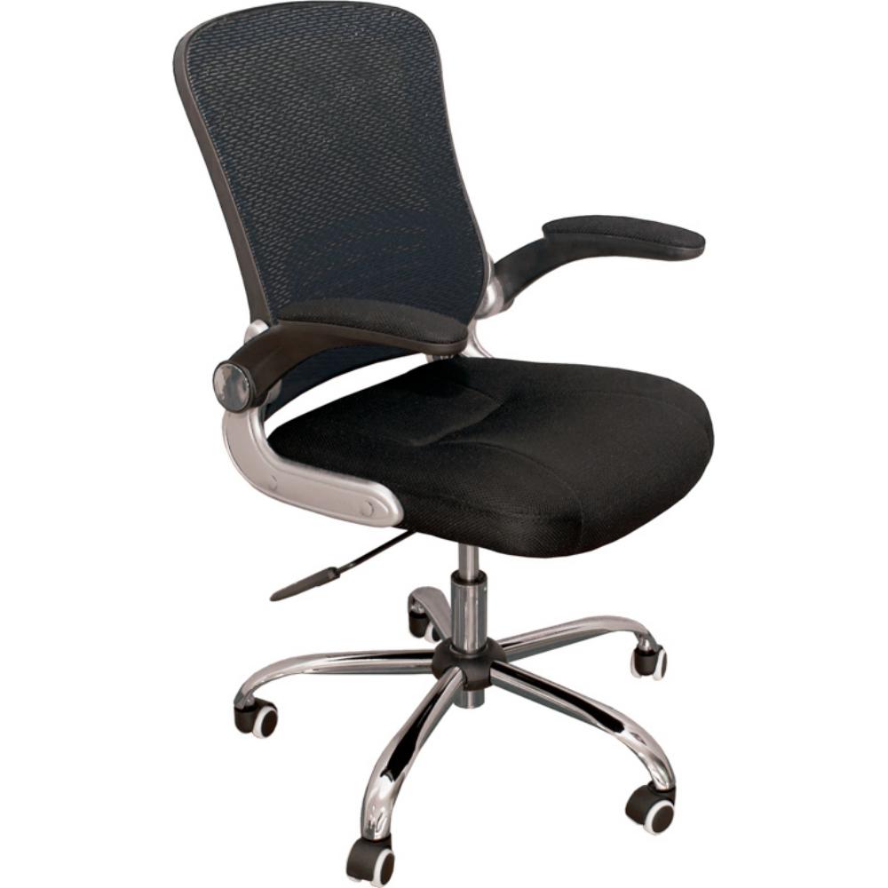 Silla con respaldo de malla negra con marco de polipropileno negro. Asiento acolchado y ajuste en altura (8 cm): entre 97 y 105 cm. Regulación en inclinación. Asiento acolchado. Brazos abatibles. Base cromada de cinco radios con ruedas. Dimensiones (anchura x altura x profundidad): 66 x 97-105 x 62 cm.
