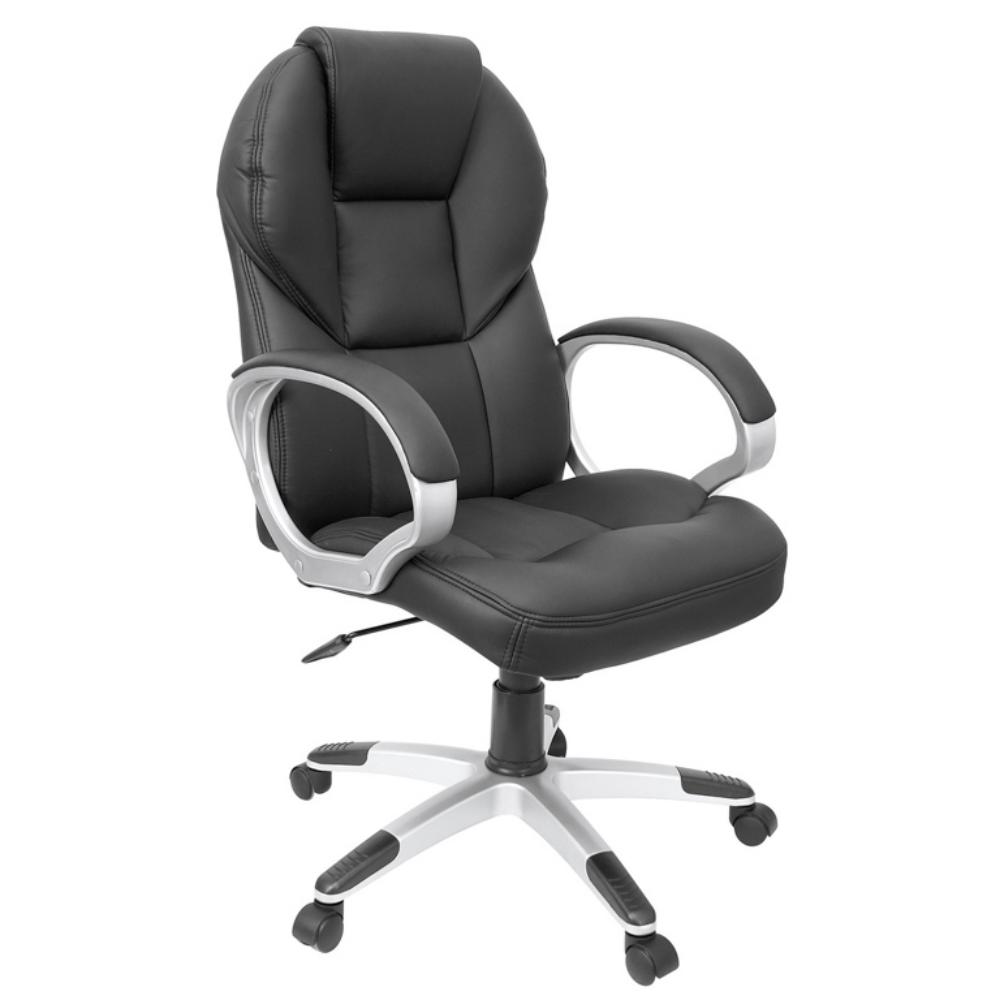 Silla ejecutiva fabricada en piel con apoyabrazos curvos y base de aluminio. Sistema basculante centrado, con aumento y disminución de la resistencia. Sistema antichoque para el retorno. Apoyabrazos en aluminio revestido en piel. Base con ruedas de 5 radios en aluminio. Asiento ajustable en altura: entre 103 y 113 cm. Color negro. Dimensiones (anchura x altura x profundidad): 61 x 103-113 x 65 cm.