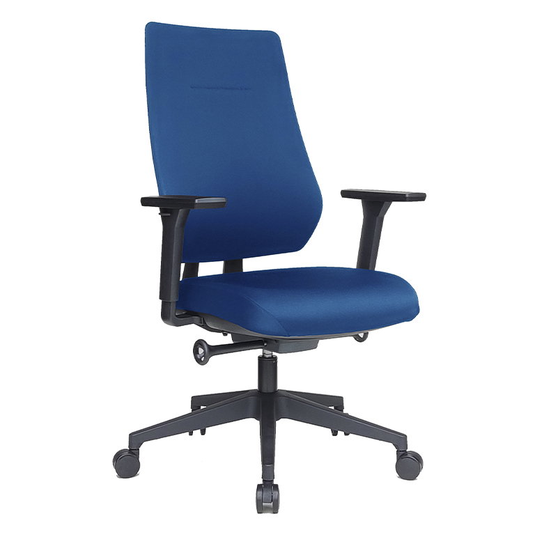 Silla de oficina operativa profesional con el asiento tapizado en tela ignífuga sobre interior de espuma inyectada y el respaldo tapizado con tela ignífuga sobre estructura inyectada en polímero técnico que incorpora sistema adaptativo de movimiento, base de polímero inyectado y robusto con mecanismo sincro con sistema de ajuste de peso automático. Regulación lumbar y asiento con regulación de profundidad. Brazos regulables 3D. Dimensiones: 49 x 110-119 x 44 cm. Color: azul.