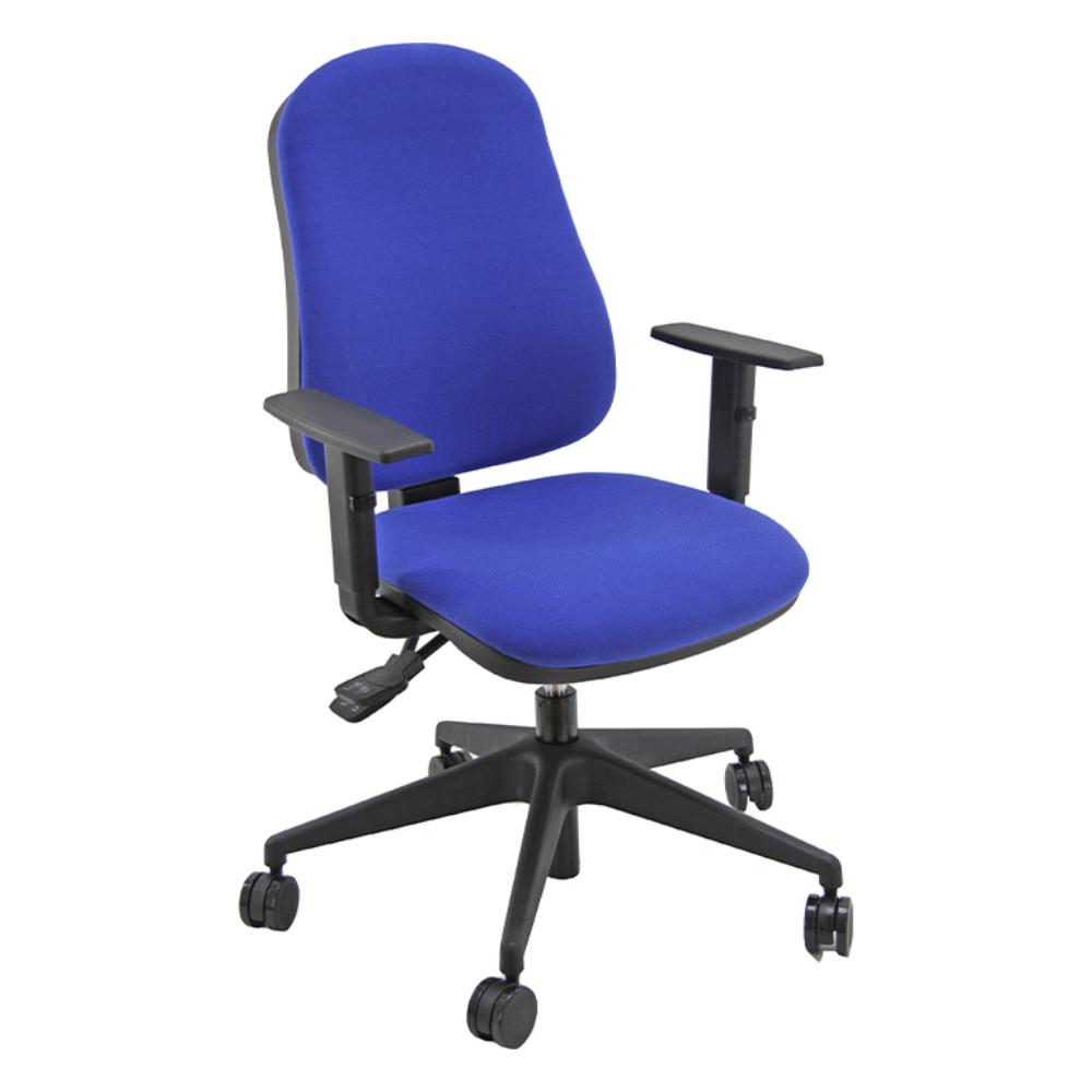 Silla de oficina giratoria con mecanismo de contacto permanente y con respaldo y asiento tapizados. Respaldo ajustable en altura y profundidad. Mecanismo de Asynchro que proporciona una regulación independiente del asiento para posiciones de trabajo prolongadas. Brazos en PP de alta resistencia ajustables en altura incluidos. Base de cinco radios de 70 cm de diámetro con ruedas de 65 mm de diámetro. Para personas de hasta 120kg.Uso recomendado 8-10 horas. Dimensiones: 64 x 105-115 x 70 cm. Color: azul.