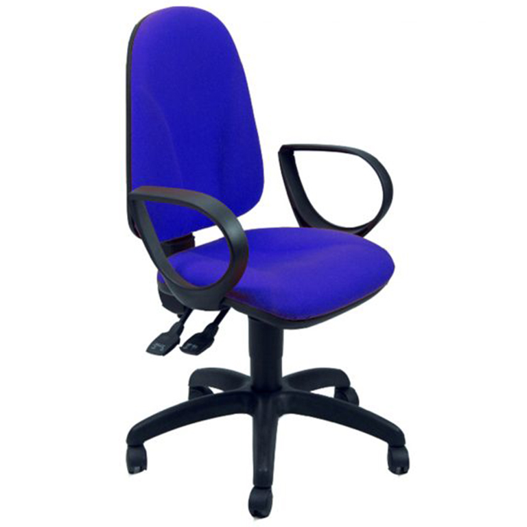 Silla de oficina giratoria con mecanismo de respaldocontacto permanente y respaldo regulable en altura. Mecanismo de la silla asíncrono entre asiento y respaldo con multibloque. Base de cinco radios 60 cm con ruedas de 50 mm de diámetro. Elevación de gas. Para personas de hasta 120kg. Uso recomendado 8 horas. Dimensiones: 44 x 96-107 x 46 cm. Color: azul.