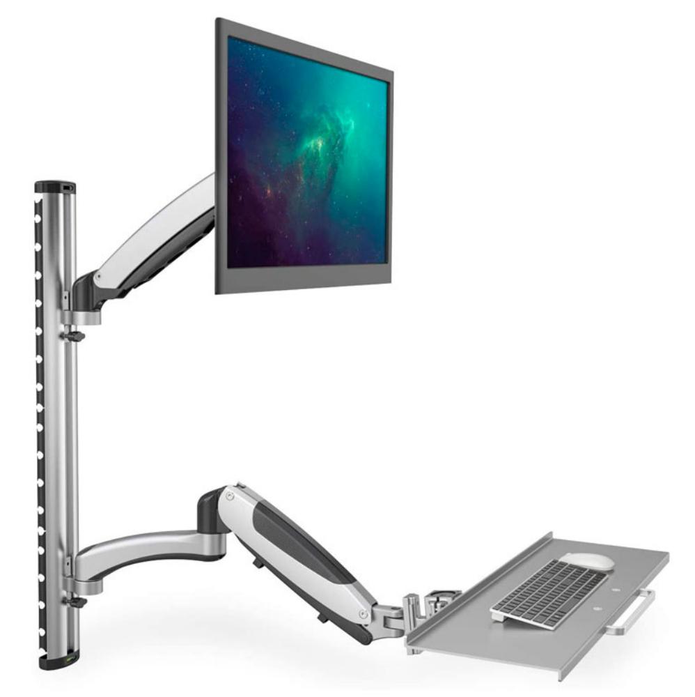 Soporte universal para montar el monitor y el teclado en la pared con ajuste de altura flexible. Para monitores desde 17 hasta 27 pulgadas, máximo 6 kg de carga por brazo. VESA 100 x 100. Gestión de cables integrada. Se puede girar de forma flexible hasta 180º. Ángulo de inclinación vertical ajustable hasta 90º. Incluye tornillos para el montaje. Peso: 4,2 kg.