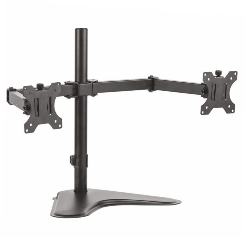 Soporte para monitor de peana doble. Eleva el monitor a la altura correcta para reducir tensión en los ojos, en el cuello y en los hombros. Gestión de cable integrada. Totalmente ajustable en altura para obtener una posición de visualización perfecta. Sistema de gestión de cables integrado. Rotación de pantalla 360º, inclinación +/- 45º, oscilación 120º. Peso: 4,87 kg. Carga máxima: 8 kg por brazo.