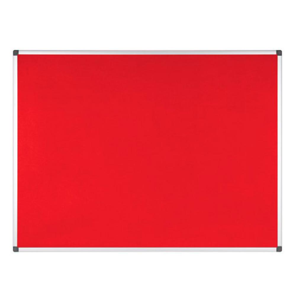 Tablero de anuncios de fieltro liso con un marco clásico de aluminio anodizado que ofrece una superficie de visualización más accesible y extensa. Fijaciones de pared ocultas a través de esquinas de plástico. Color: rojo. Medidas: 90 x 60 cm.
