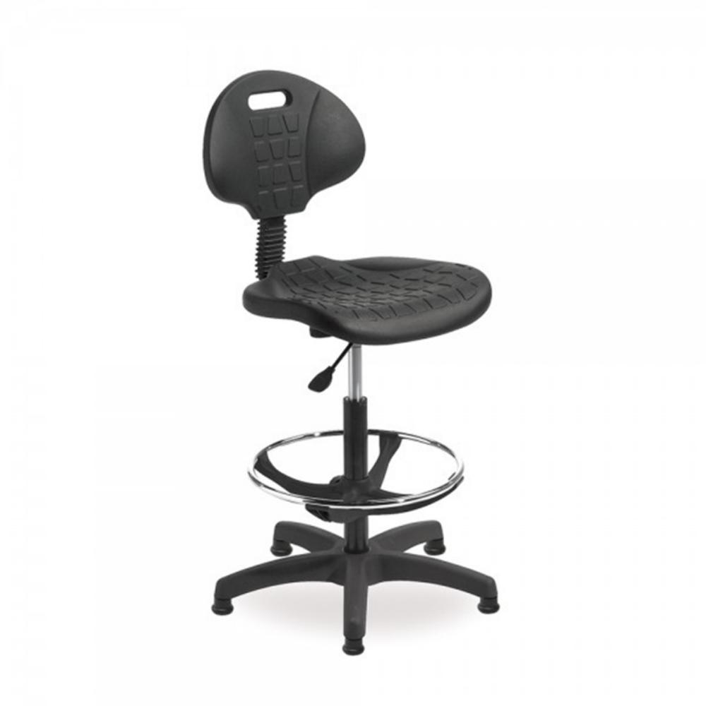 Taburete de uso industrial de alta resistencia. Asiento y respaldo en polímero técnico. Regulable en altura mediante pistón de gas. Aro resposapiés metálico de 45 cm dediámetro. Especial para laboratorios, tallerenes, etc. Resistente a sustancias abrasivas. Base poliamida de alta resistencia de 5 radios y 63 cm de diámetro. Dimensiones: 44 x 118 x 47 cm.