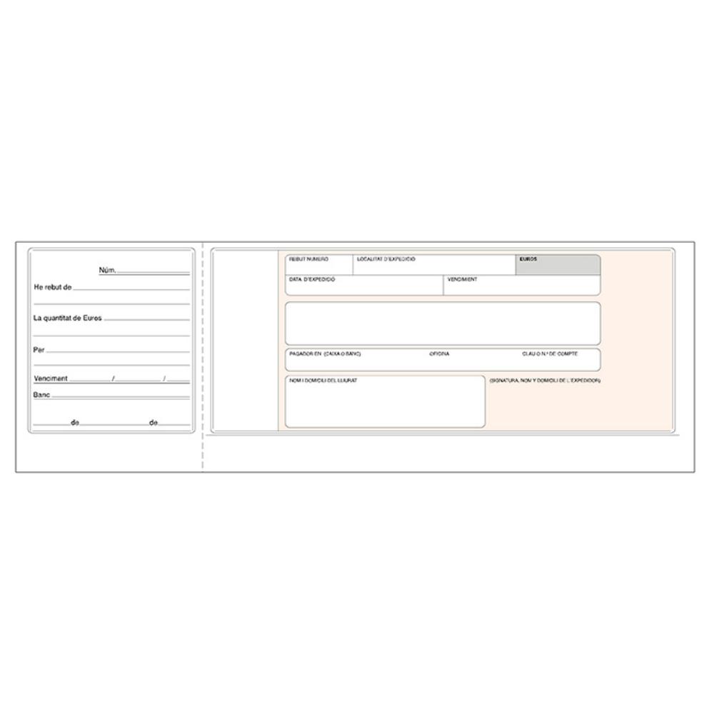 Talonario de recibos impreso en dos colores, en idioma catalán. Formato apaisado. Juego original de 100 hojas. Medidas: 300 x 107 mm. Envase de 5 unidades.