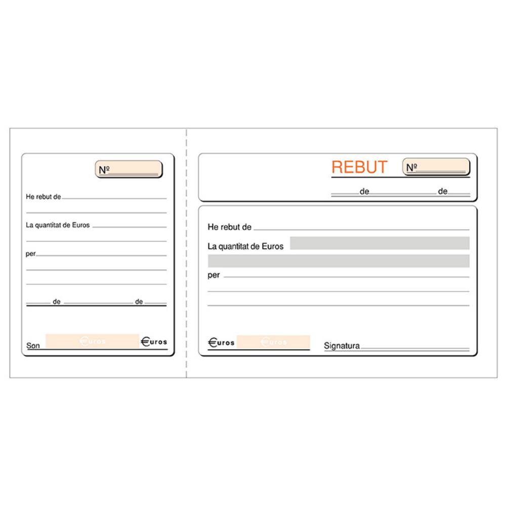 Talonario de recibos impreso en dos colores, en idioma catalán. Formato apaisado. Juego original de 100 hojas. Medidas: 210 x 105 mm. Envase de 10 unidades.