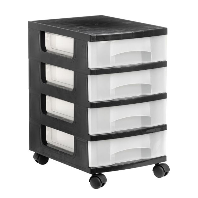 Torre de almacenaje sostenible Archivo 2000 con 4 cajones de 6 litros con ruedas. Fabricada en polipropileno copolímero 100% reciclado y reciclable, con aditivo antiestático que facilita la limpieza y evita la acumulación de polvo. Destaca por su gran resistencia y estabilidad. Ideales para el hogar, la oficina, centros educativos, clínicas, hospitales, etc. Carcasa en color negro opaco y cajones cristal translúcido. Medidas interiores de los cajones: 342 x 220 x 79 mm. Medidas exteriores: 390x290x480 mm. Fabricado en España