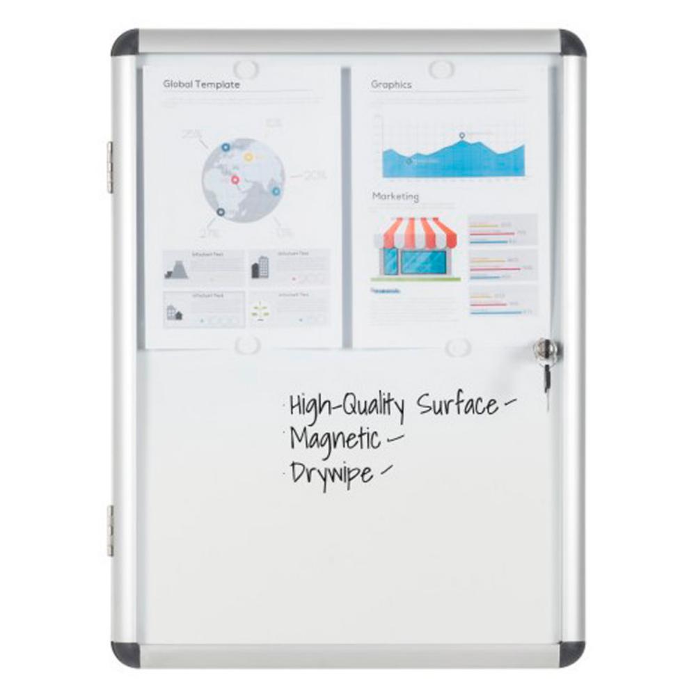 Vitrina magnética con diseño elegante y moderno. Capacidad para 4 hojas A4. Marco de aluminio resistente con puerta de acrílico y cierre mediante llave. Fondo de acero lacado magnético para usar con imanes o marcadores de borrado en seco. Fácil de instalar. Profundidad de 18 mm de espacio útil para imanes. Profundidad total 35 mm. Dimensiones: 50 x 67,4 cm.