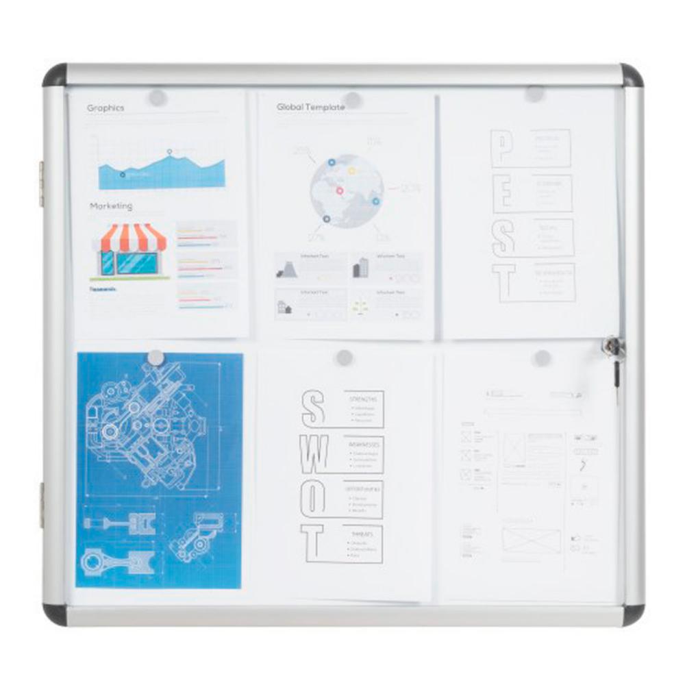 Vitrina magnética con diseño elegante y moderno. Capacidad para 6 hojas A4. Marco de aluminio resistente con puerta de acrílico y cierre mediante llave. Fondo de acero lacado magnético para usar con imanes o marcadores de borrado en seco. Fácil de instalar. Profundidad de 18 mm de espacio útil para imanes. Profundidad total 35 mm. Dimensiones: 72 x 67,4 cm.