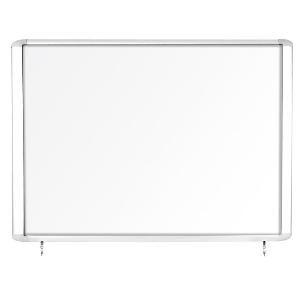Marco de aluminio resistente con puerta de acrílico y cierre mediante doble llave, apertura vertical. Fondo de acero lacado magnético para usar con imanes o marcadores de borrado en seco. Es impermeable, con cerradura resistente a la intemperie. Profundidad de 18 mm de espacio útil para imanes. Profundidad total 59 mm. Medidas: 1230 x 981 mm.
